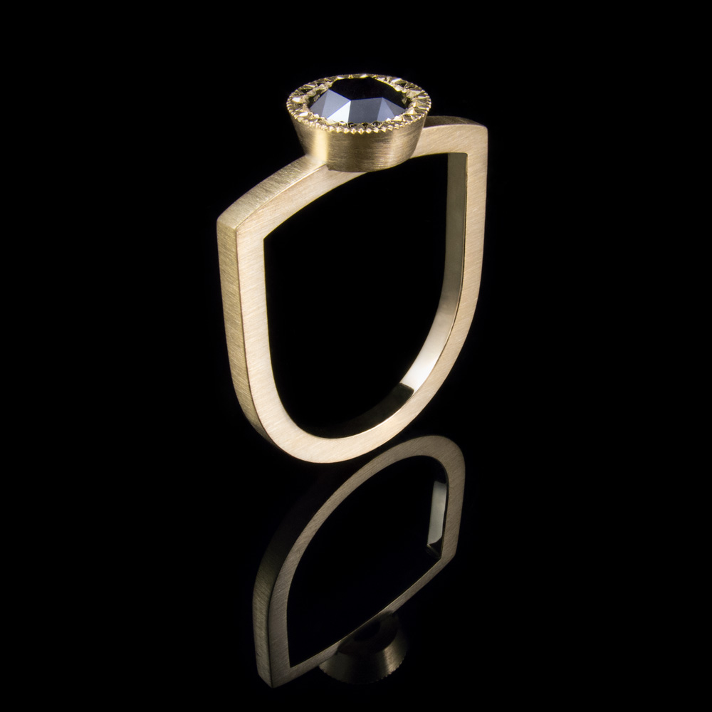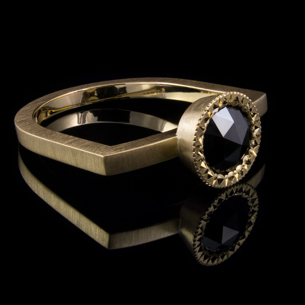 Handmade in 18 ct yellow gold this ring is a bespoke version of Isabelle’s Objectivity ring. It is set with a 6mm round rose cut black diamond with some very fine engraving around the setting edge. Isabelle’s client commissioned this piece as part of a stack, one of which is her existing wedding band, the other a slimmer version of the side set Zeitgeist ring. Both rings are architectural, yet feminine in design and have subtle detailing that might not reveal itself at first glance. They look fantastic as a stack, but are equally wearable on their own. It was an absolute pleasure working with the client to bring these two pieces to life!