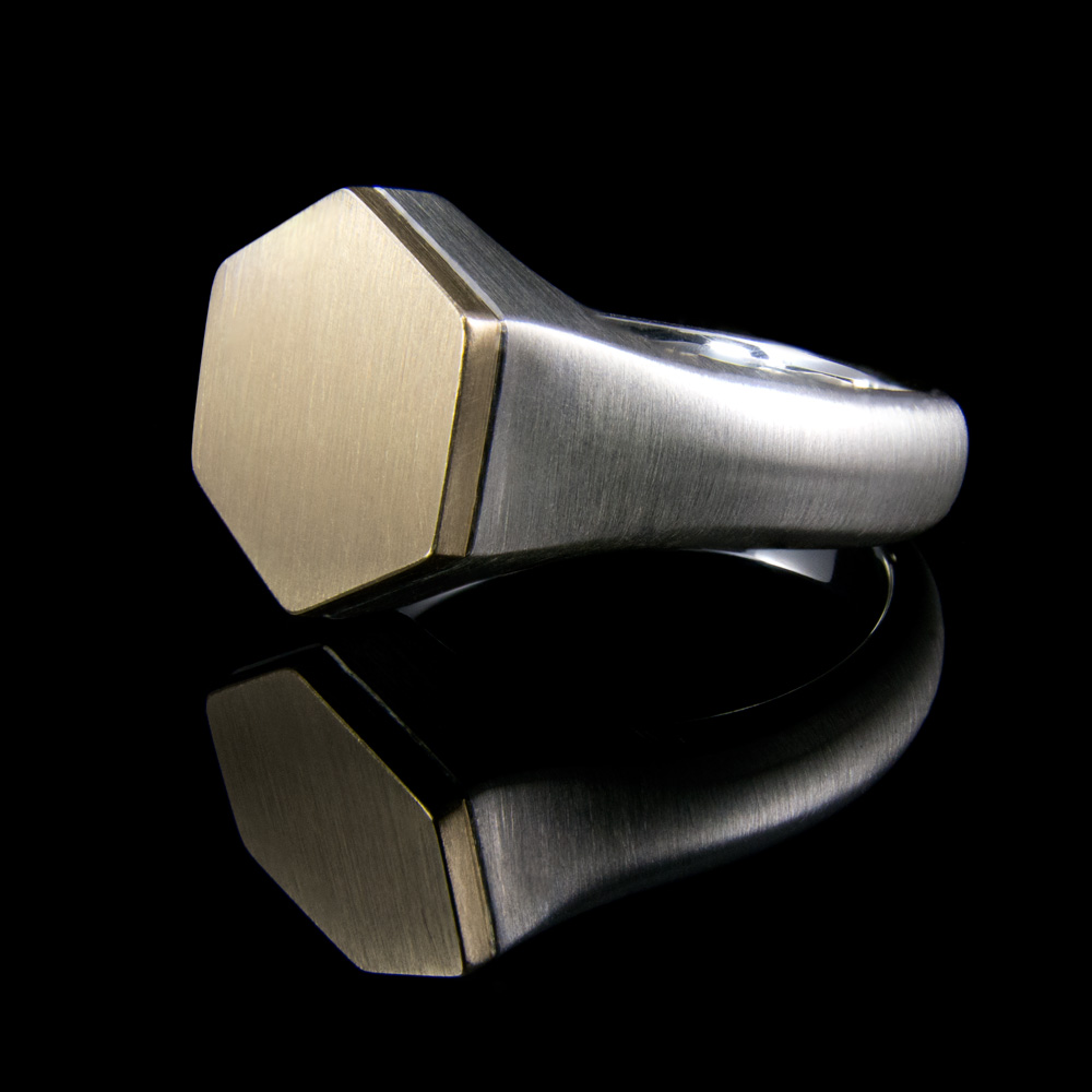 Small hexagonal signet ring in silver with a 9kt yellow gold top. A hand engraved line seperates the two metals, creating a subtle contrast to the overall satin finish of the ring.
