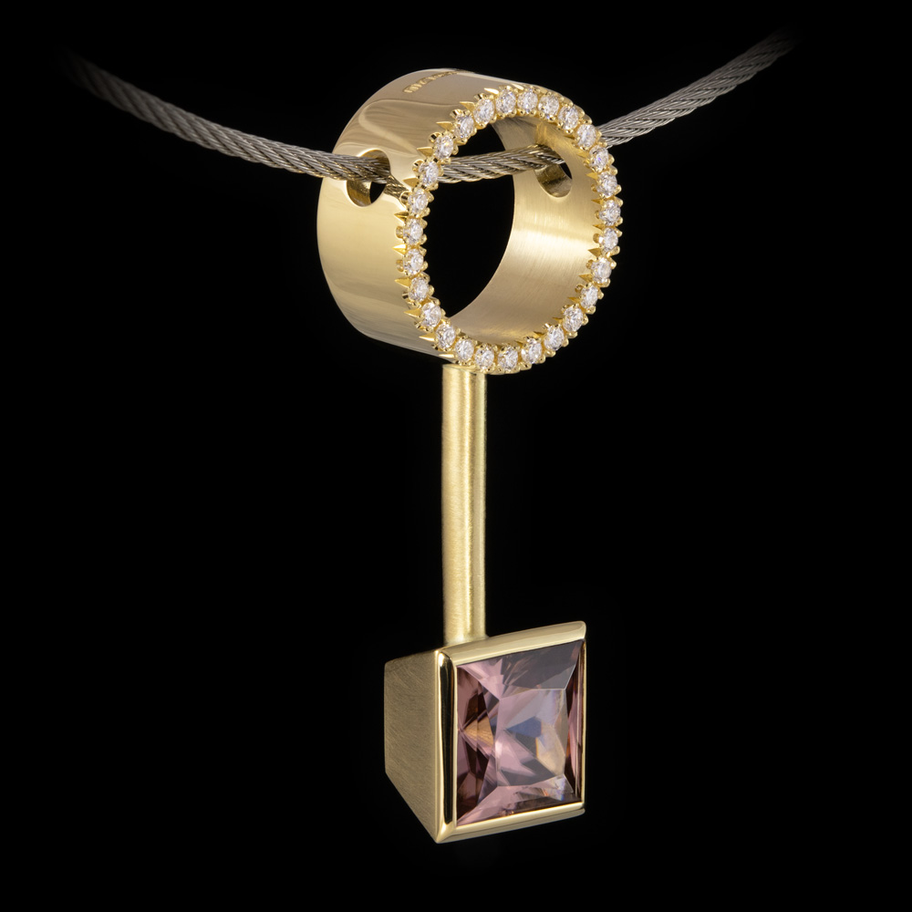 The focal point of this handmade 18kt yellow gold pendant is a beautiful 2.73ct Malayan Zircon. The rich brown-red colour is intensified by the warm yellow gold surrounding it, while the circle of white diamonds adds sparkle. Functional can be pretty after all.