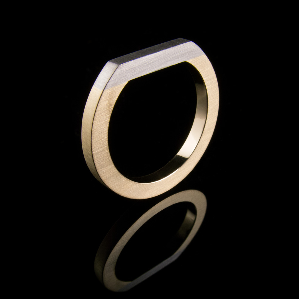 Minimalist band from the Objectivity series. Made from 9kt yellow gold and Palladium, the straight lines and brushed finish enhance the simplicity of this design.