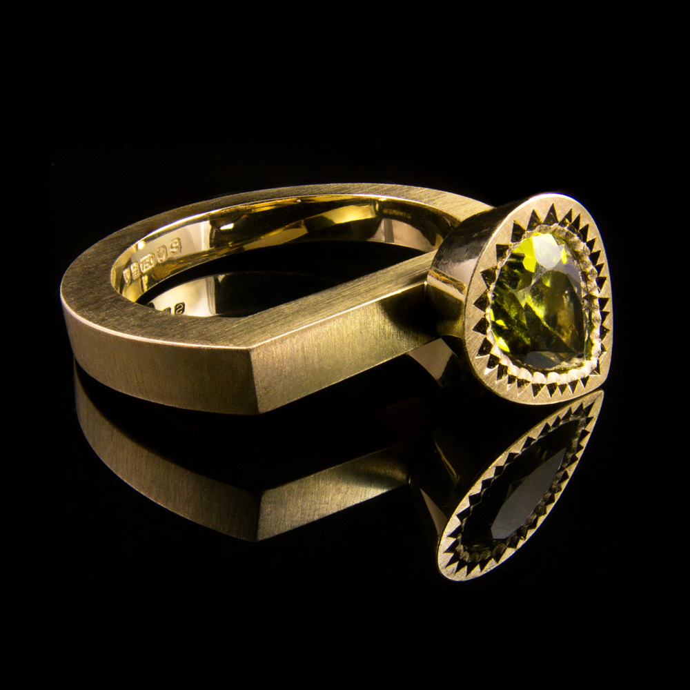 Handmade 18 kt yellow gold ring set with a stunning pear cut green tourmaline. Streamlined design with the stone sitting off centre and at an angle making it appear to be floating between fingers when viewed from above. The ring can be worn alone, as part of an alternative engagement ring set or as an everyday stacking ring.
