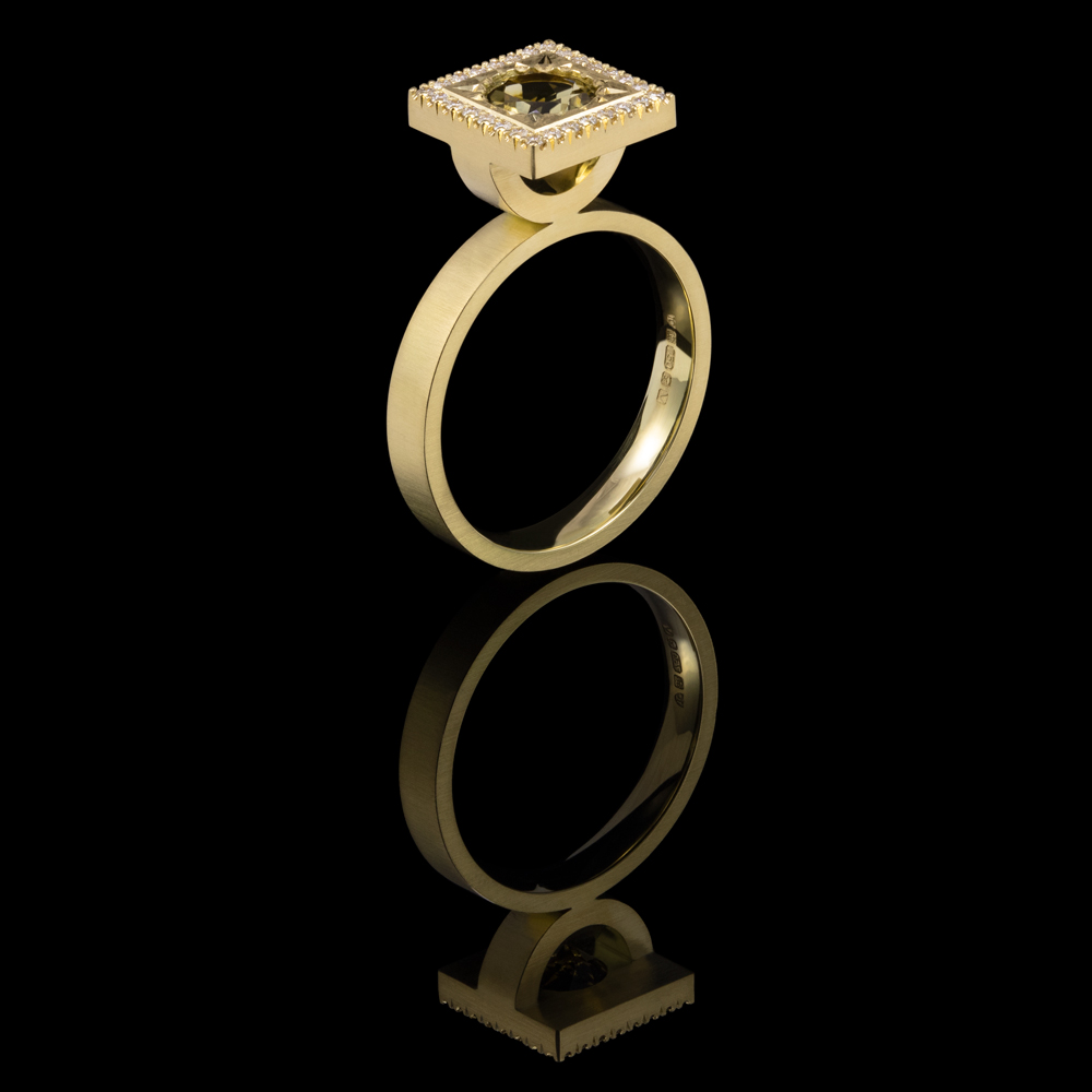Every now and then I can’t resist the urge to add some sparkle – usually in the form of diamonds. This piece is full of contrasts: warm greens and yellows are off-set by bright white diamonds, a clean minimal shape keeps the playfulness of the engraved top in check. Who says minimal can’t be detailed?
