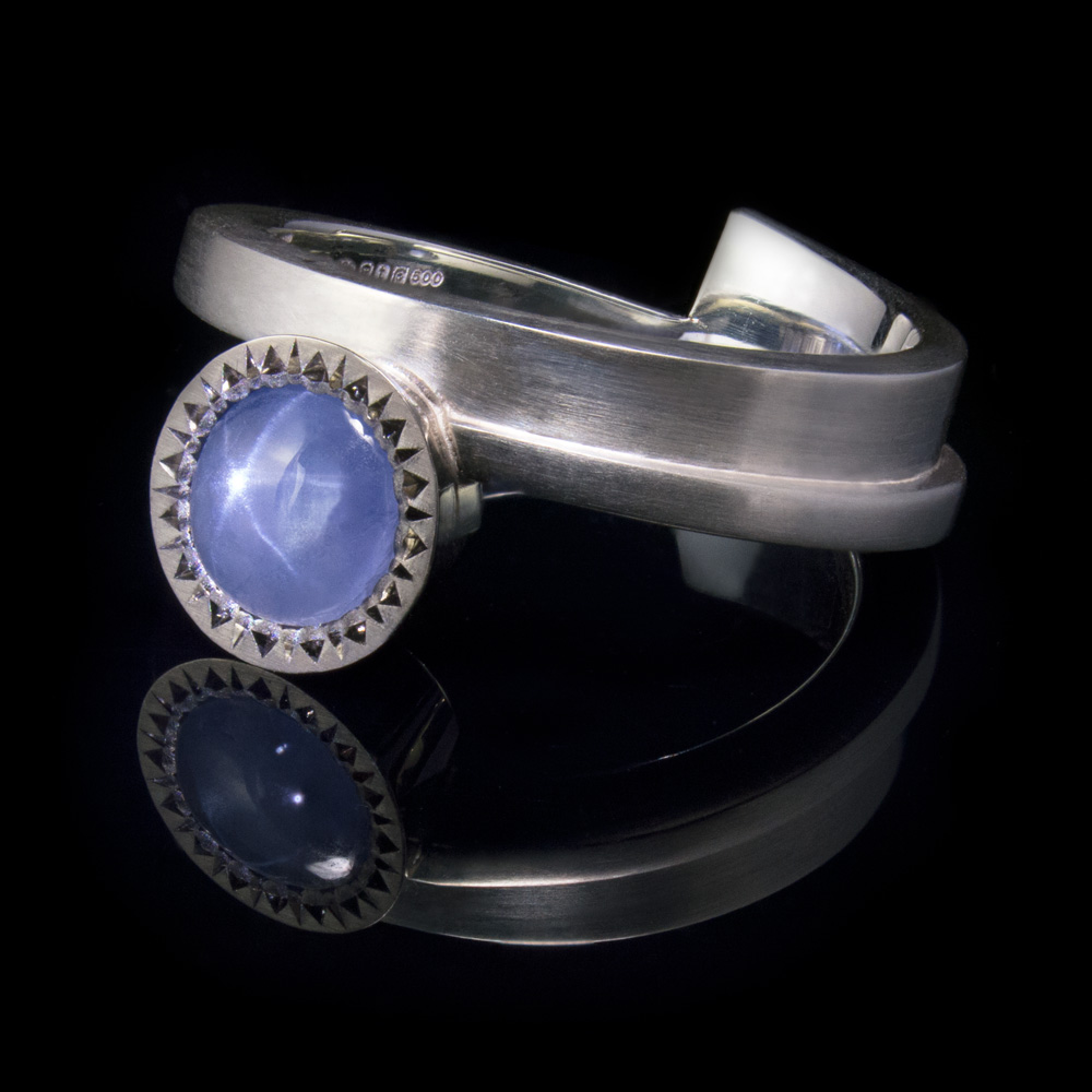 Cute little star sapphire set into palladium with a sterling silver hand forged ring shank. The cool greys of the metal make fantastic companions for the dove blue of the star sapphire.